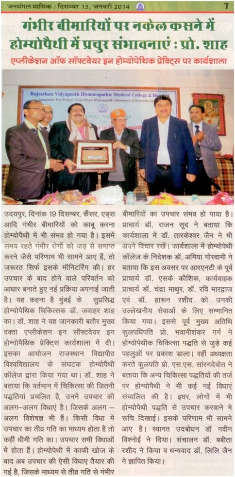 Udaipur, date 19th December 2013– Workshop on role of Homeopathy in incurable diseases and application of software in Homeopathic practice was held at Rajasthan on 19th December 2013. The workshop was organized by Rajasthan Vidyapeeth Homeopathic Medical College & Hospital. Dr. Jawahar Shah, himself a legend in the homeopathic domain explained the scope of Homeopathy in treatment of incurable diseases like Cancer and A.I.D.S. He also mentioned that regular monitoring played huge role in treating difficult conditions.